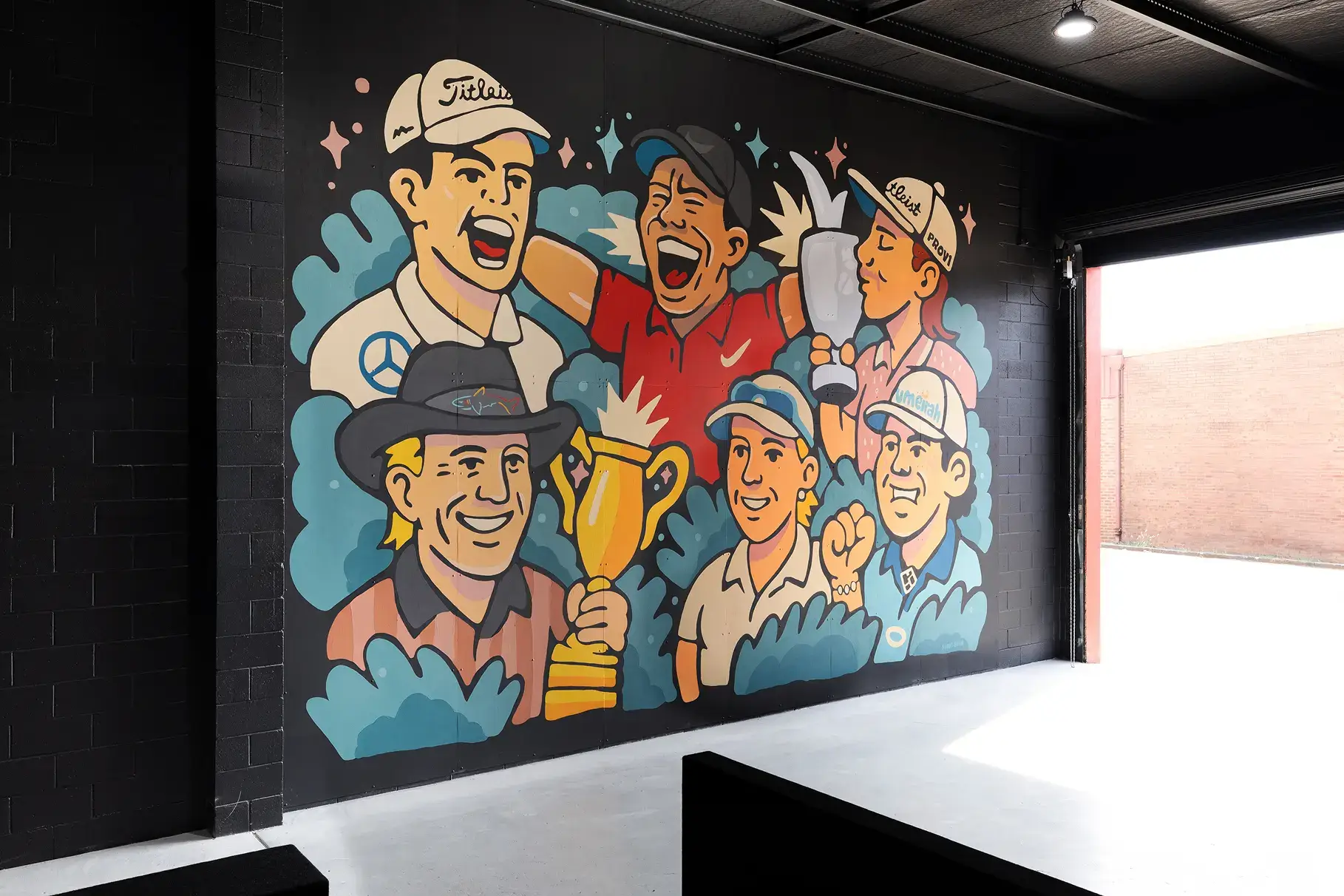 To further enhance the in-studio experience, we engaged a local artist to create a bespoke mural that captures historical golf moments in a fun and unique style. The artwork celebrates key Australian players and iconic events, adding a sense of heritage and personality to the space while reinforcing Apex Golf Studio’s connection to the sport’s rich history.