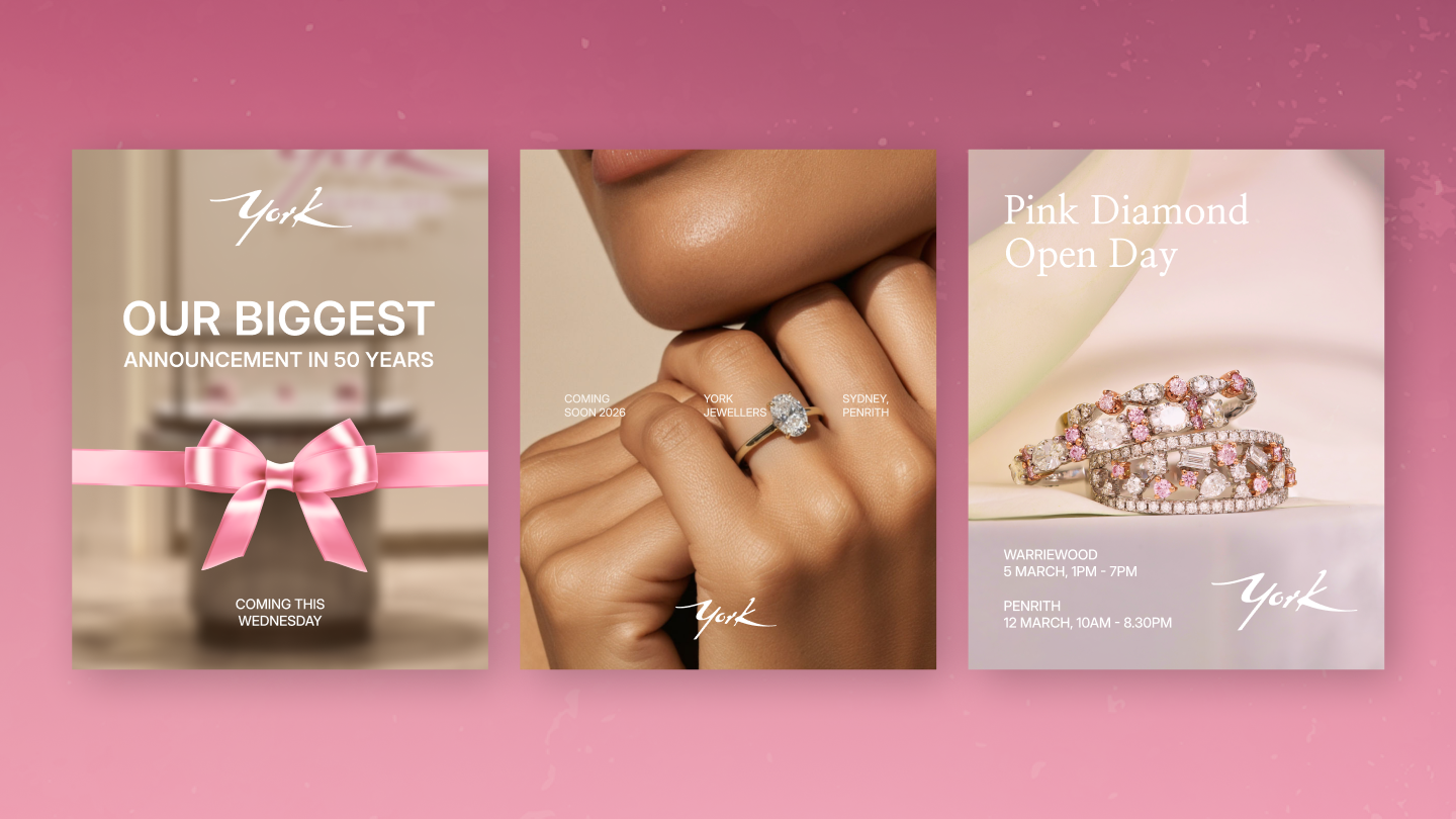 The journey included logo design and the development of clear branding guidelines, giving York Jewellers a more resolved visual identity and a consistent framework for how the brand should appear across every touchpoint. From there, Masters Agency rolled out a suite of print and digital design assets that brought the identity into everyday communications, promotional collateral and branded content. Each piece was crafted to feel polished and premium, helping York Jewellers present itself with the same care, detail and sophistication found in its jewellery.